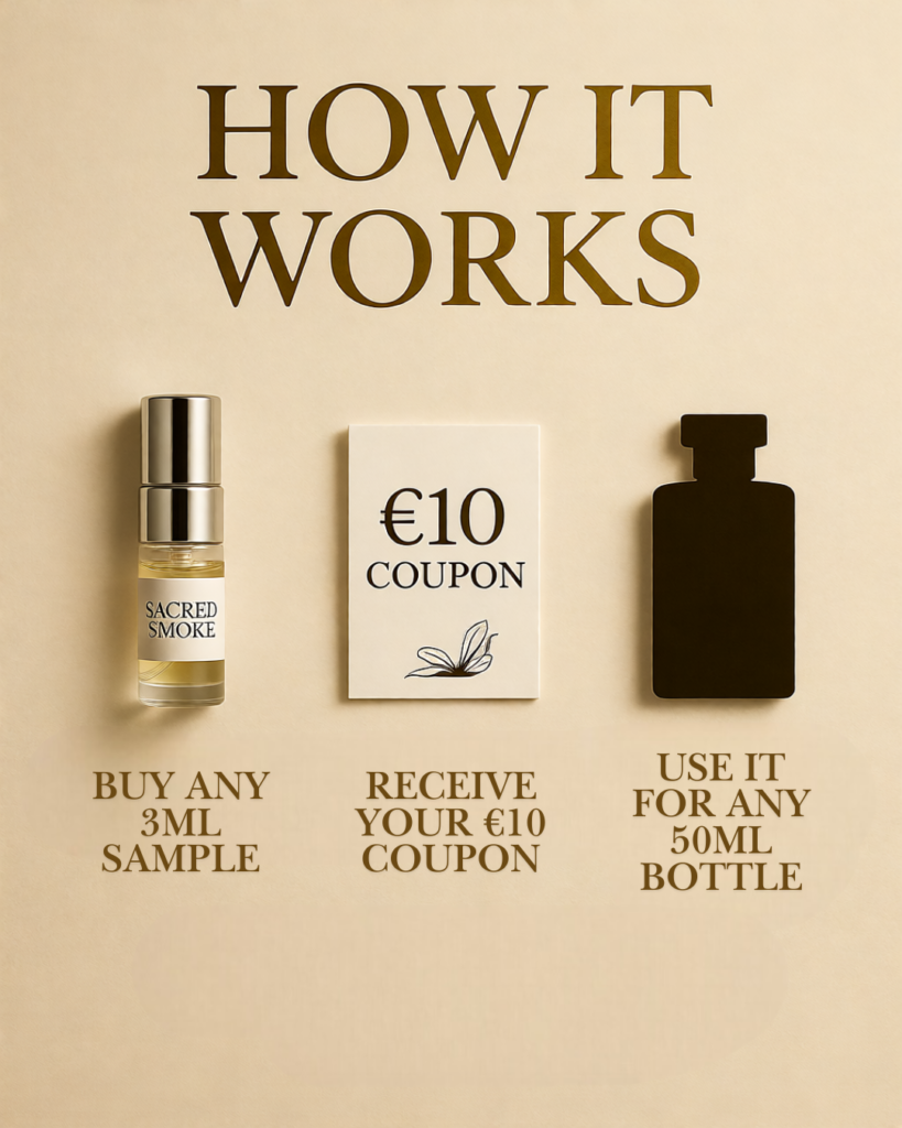 When you order any 3ml perfume sample, we include a printed €10 discount coupon in your package. Use it toward any 50ml full-size bottle — and your sample is essentially free.